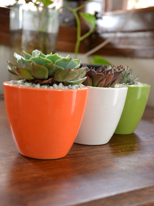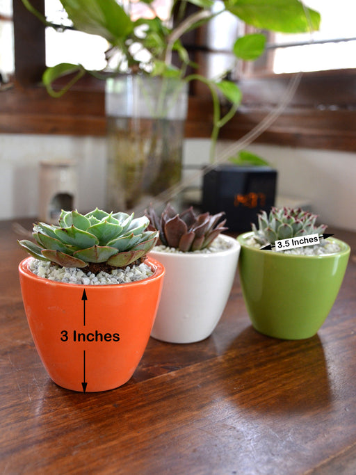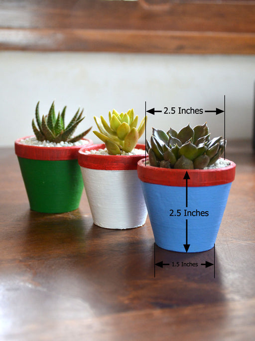 MudfingersIn stockCeramic Pot Size : 3" tall; 3.5" wide inches Tricolor Succulents in Ceramic Pots (Set of 3) : 3 beautiful Ceramic pots themed on our Indian Flag, w...