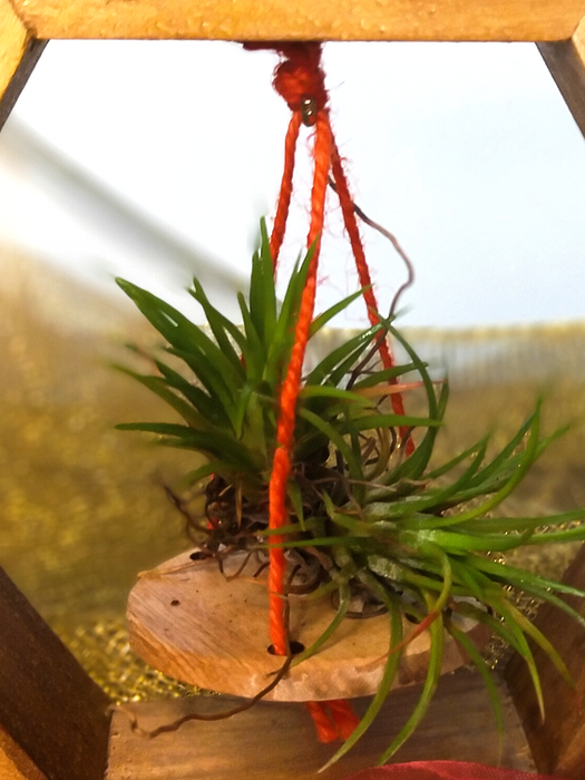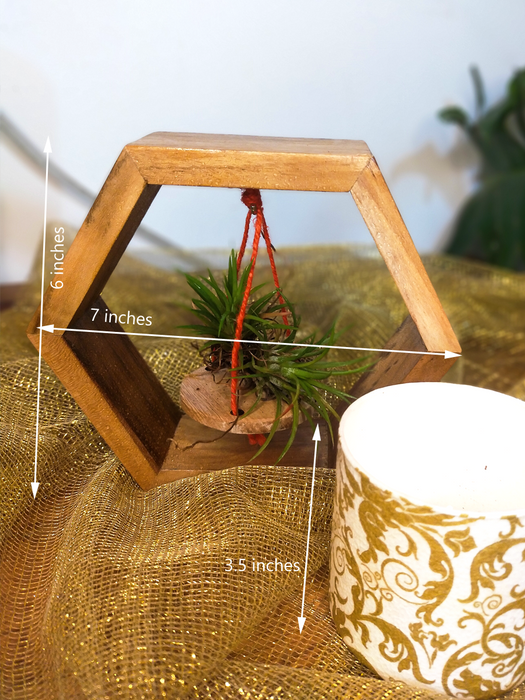 2 Tillandsia are mounted on a Hexagonal Wooden Frame.