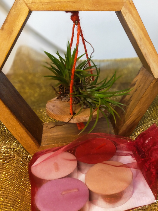 Air Plant on Hexagonal Wooden Mount with Scented Tea lights and an Elegant holder