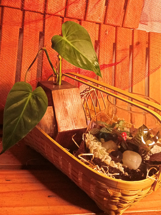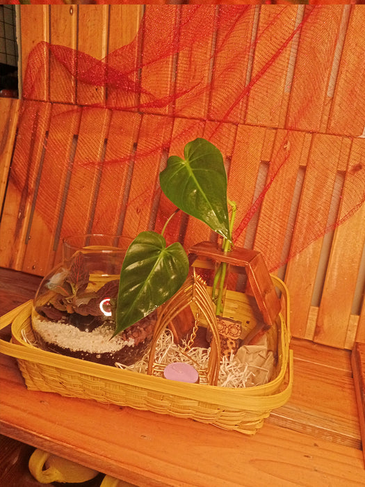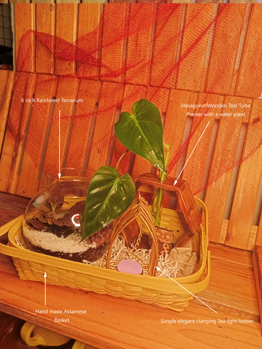 Basket of Elegance - Hamper with a Terrarium, Wooden Hydroponic Planter, Elegant Diya all in an Assamese basket