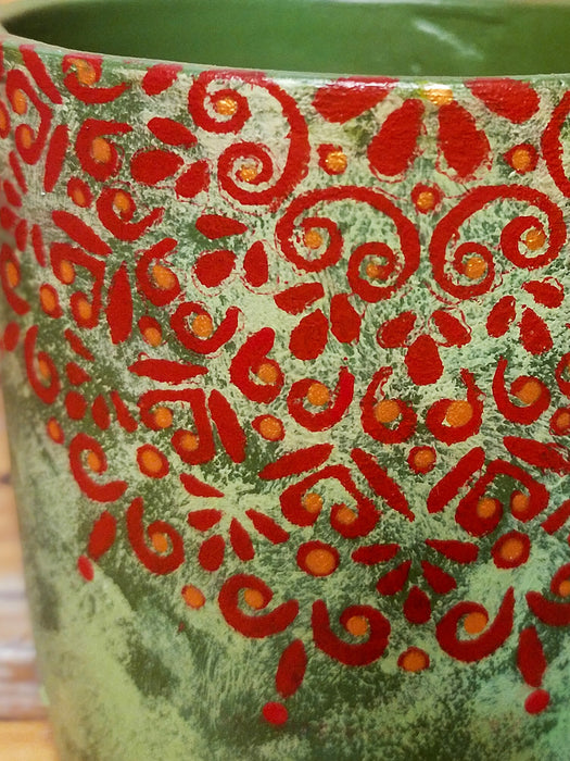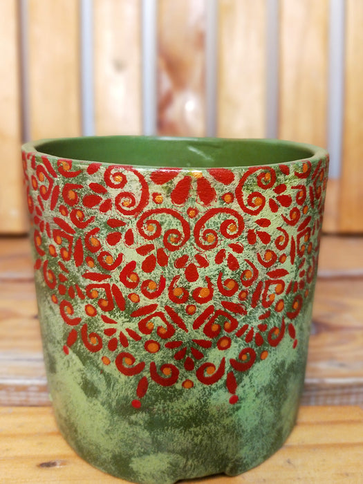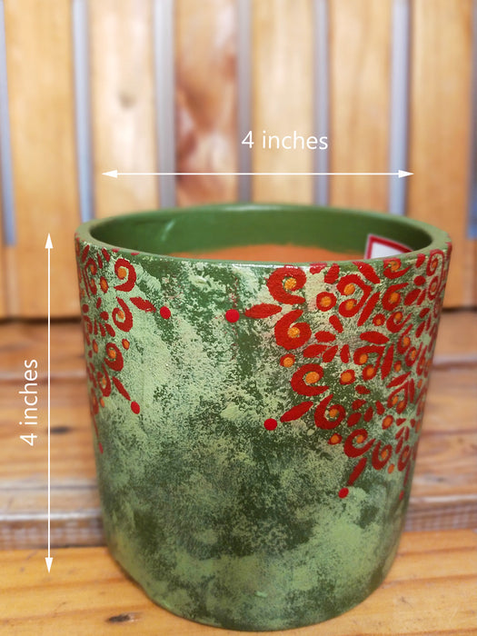 A 4 inch banded Terracotta pot with hand painted design to gift your loved ones a totally one-of-a-kind gift. This is a unique single piece only. (Please contact us if you need more numbers in similar design)