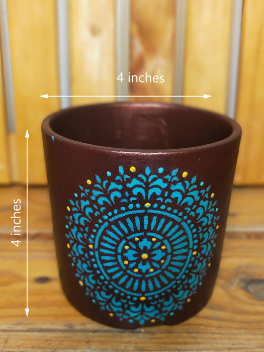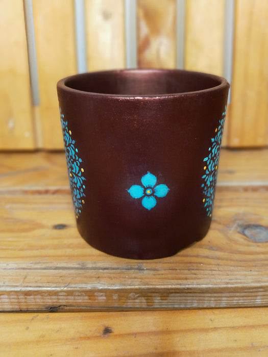 A 4 inch banded Terracotta pot with hand painted design to gift your loved ones a totally one-of-a-kind gift. This is a unique single piece only. (Please contact us if you need more numbers in similar design)