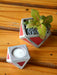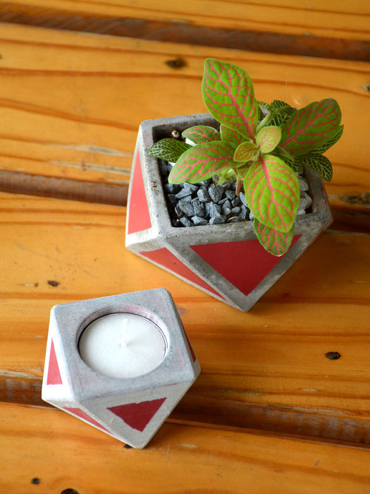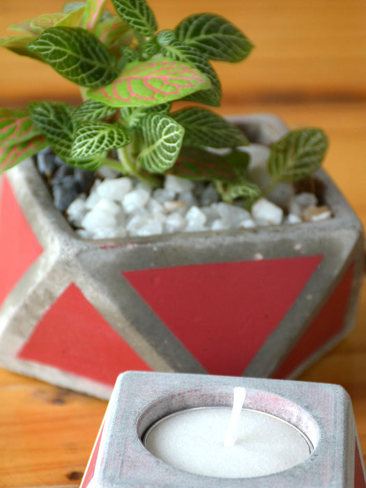 Vibrant coloured Fittonia plants are planted in a bright coloured concrete pot painted with a Deepawali theme. For this Deepawali festival, we are adding a tea candle in a styled holder similar to the planter theme. Makes some great gifts!!