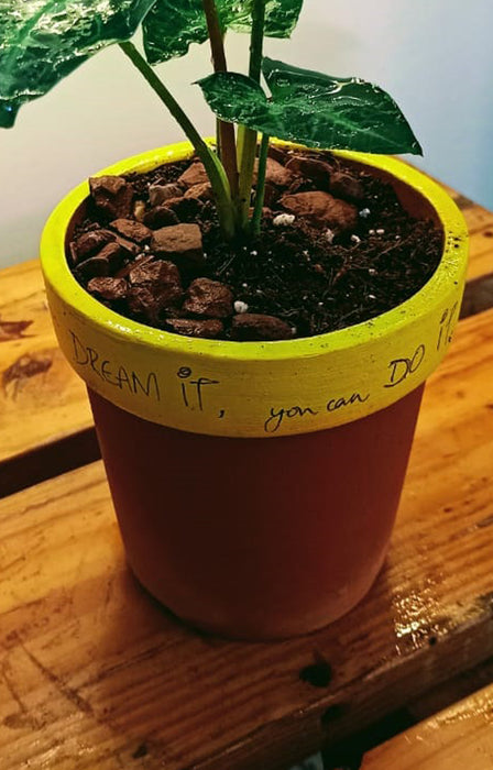 A perfect gift for motivation to Dream and achieve. A miniature indoor Syngonium is planted in a banded terracotta pot with the inscription of Dream it: You can do it!
