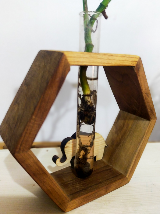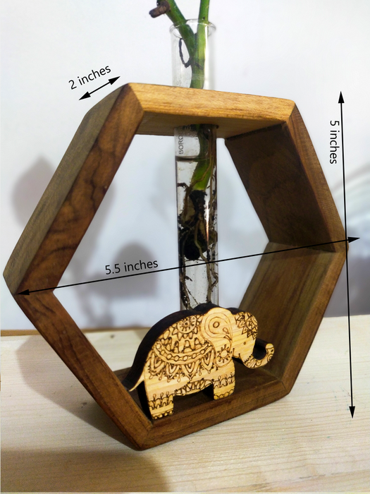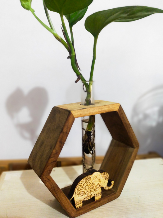 An Elephant  figurine mpunted on a hexagonal shaped wooden frame holds one test tube with a money plant.