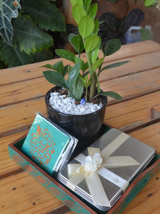 Green Lantern Hamper - A beautiful combination of a ZZ houseplant in a opulent black 5 inch ceramic pot, a yummy chocolate box, a lovely hand painted and decoupaged wooden tray with matching coasters. This Zero waste hamper is a lovely pack of gratitude for thoughtfulness to our loved ones.