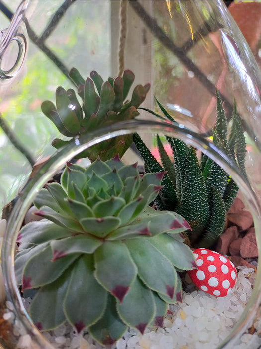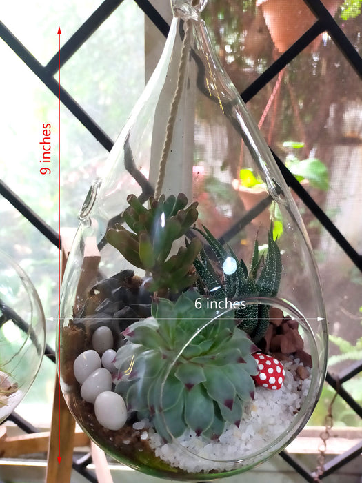 Hanging Tear Drop Terrarium (Open Terrarium) : This exclusive borosilicate tear drop shaped jar hosts an eclectic mix of succulents that are hardy and will thrive great in well lit indoors or in balconies.