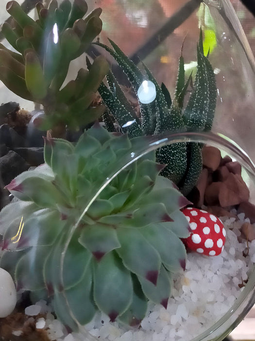 Maintenance : Succulents require little maintenance. To discourage rot, it is best to remove fallen leaves from the terrarium. It is also good to allow the terrarium to receive fresh air from an open window when the weather allows.