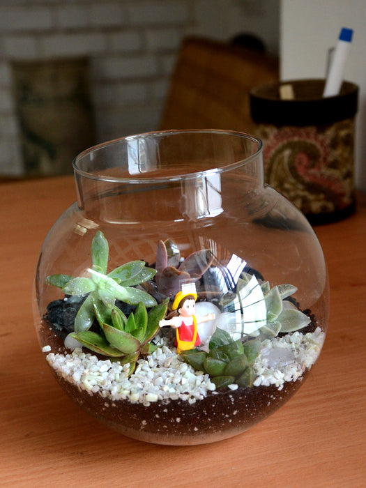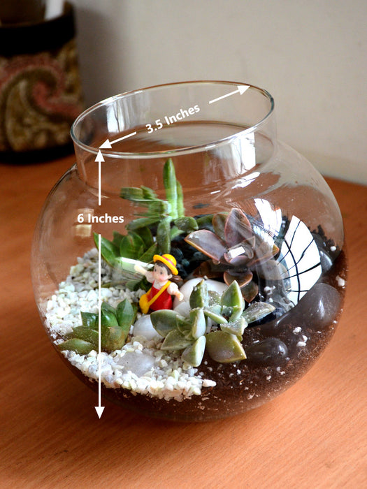 Round Succulent Terrarium (4 Inches - Open Terrarium) : A terrarium is a collection of small plants growing in a transparent, sealed or open container. Inside a terrarium's walls, many natural processes may be observed: photosynthesis, respiration and the water cycle.