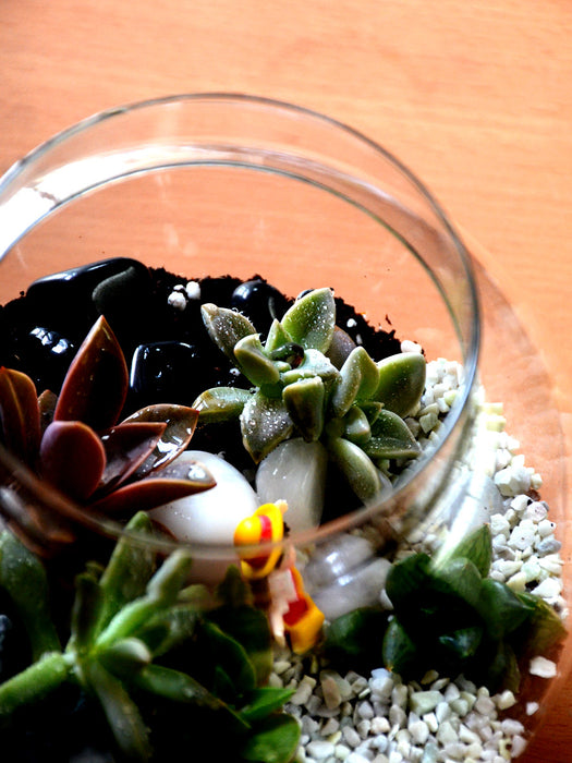 Maintenance : Succulents require little maintenance. To discourage rot, it is best to remove fallen leaves from the terrarium. It is also good to allow the terrarium to receive fresh air from an open window when the weather allows.