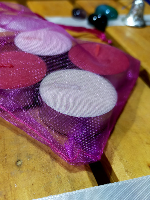 Mini Scented Candles : A set of 4 scented tea candles packed in a pretty shimmer pouch.