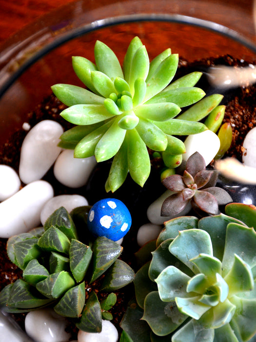 Maintenance : Succulents require little maintenance. To discourage rot, it is best to remove fallen leaves from the terrarium. It is also good to allow the terrarium to receive fresh air from an open window when the weather allows.
