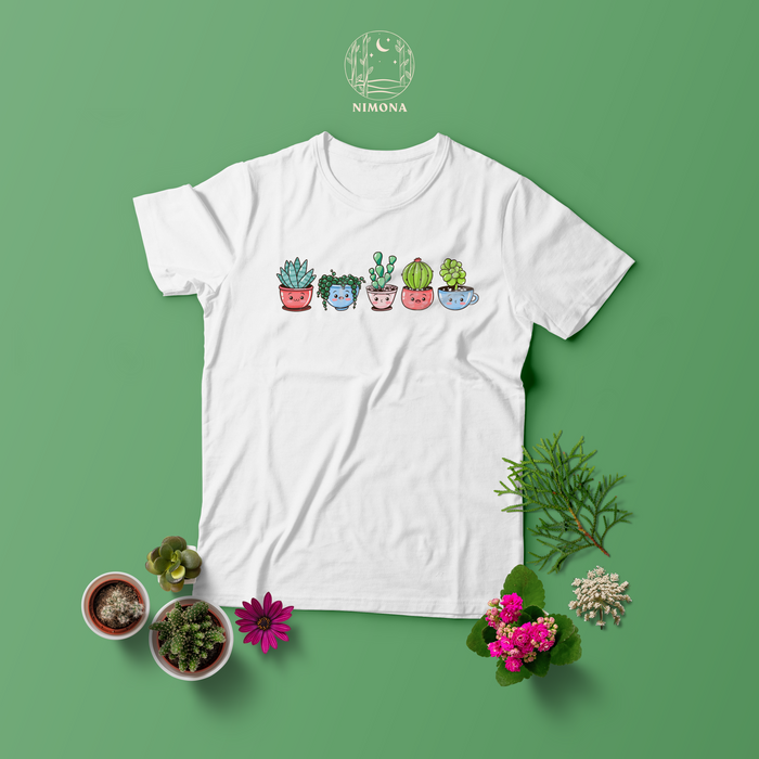 Small Succulent in cute pots, the exact style of Mudfingers store are depicted in this lovely Tee shirt. Apt one for the succulent collector in you!