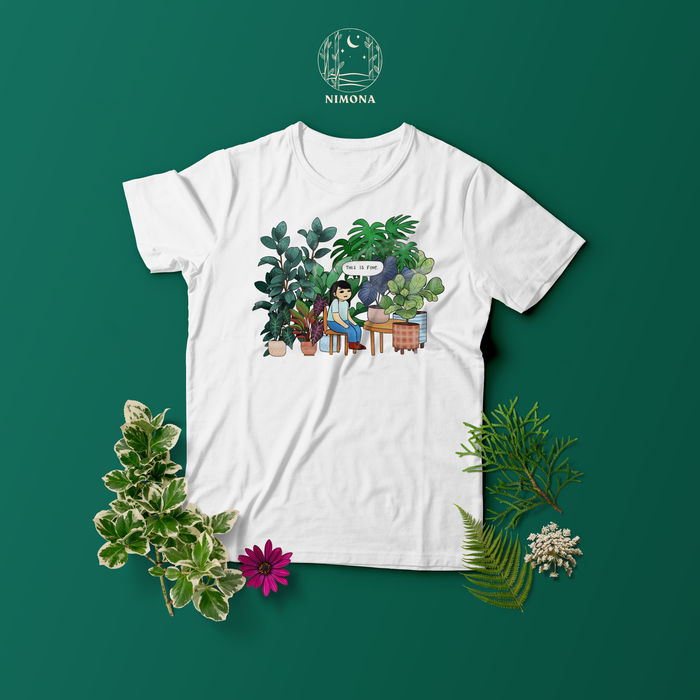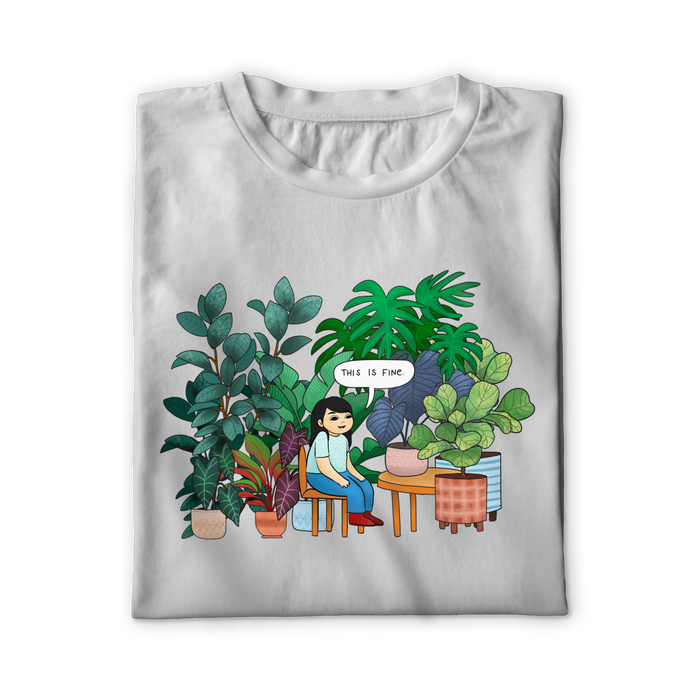 The beauty of sitting among greens is shown in this lovely printed tee. Sitting happy amongst Towering plants of Rubber, Alocasia, Fiddle Leaf, Philodendron is a happy plant person!