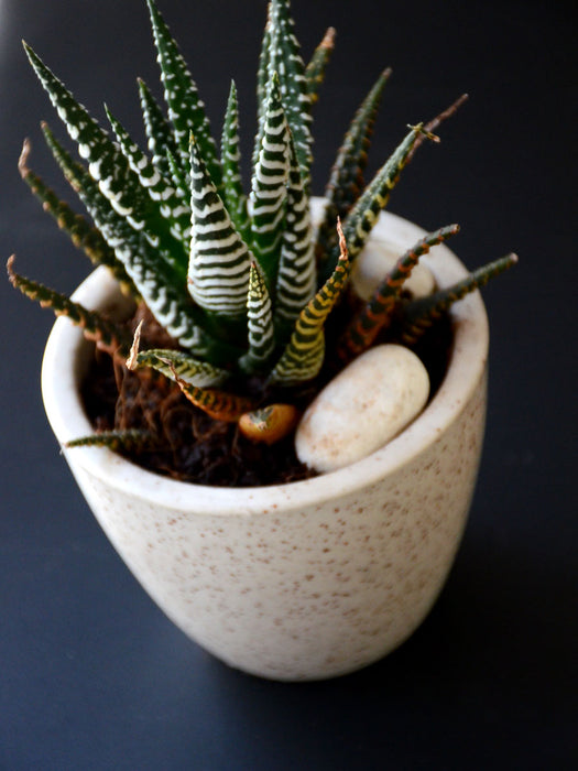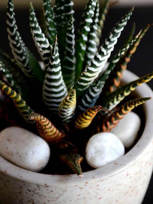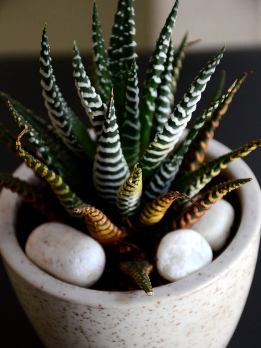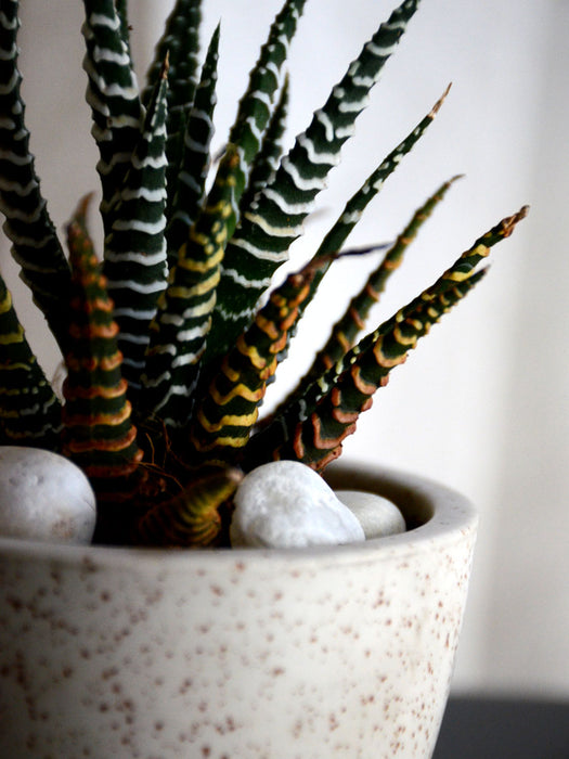 Zebra Cactus: It is planted in a beautiful white ceramic pot that sets off the stripes of this eye catcher!